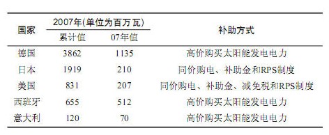 在太陽能發(fā)電上領(lǐng)先的歐洲,主要采用電力公司以高于普通電力的價格購買太陽能發(fā)電系統(tǒng)所發(fā)的電力。而美國和日本則采用與普通電力相同的價格購買太陽能發(fā)電系統(tǒng)所發(fā)的電力。美、日還補(bǔ)助用戶購置太陽能發(fā)電系統(tǒng)。下表列出了幾個先進(jìn)國家的太陽能發(fā)電的發(fā)電量(單位為百萬瓦)和補(bǔ)助措施。