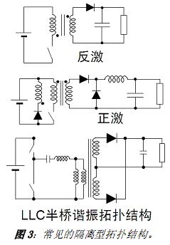 電路中通常加入了變壓器的隔離型AC-DC 電源轉(zhuǎn)換包含反激、正激及半橋等拓?fù)浣Y(jié)構(gòu),參見圖3,其中反激拓?fù)浣Y(jié)構(gòu)是功率小于30 W 的中低功率應(yīng)用的標(biāo)準(zhǔn)選擇,而半橋結(jié)構(gòu)則最適合于提供更高能效/功率密度。就隔離結(jié)構(gòu)中的變壓器而言,其尺寸的大小與開關(guān)頻率有關(guān),且多數(shù)隔離型 LED 驅(qū)動器基本上采用“電子”變壓器。