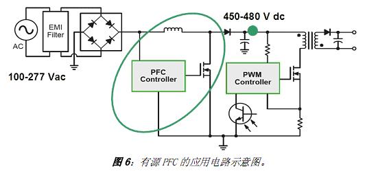 有源 PFC(見圖6)通常是作為一個專門的電源轉(zhuǎn)換段增加到電路中來改變輸入電流波形。有源PFC 通常提供升壓,交流100 至277 Vac的寬輸入范圍下,PFC 輸出電壓范圍達(dá)直流450 至480 Vdc。如果恰當(dāng)?shù)卦O(shè)計PFC 段,可以提供91%到95%的高能效。但增加了有源PFC,仍然需要專門的DC-DC 轉(zhuǎn)換來提供電流穩(wěn)流。