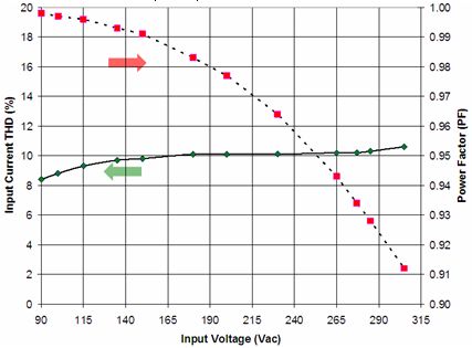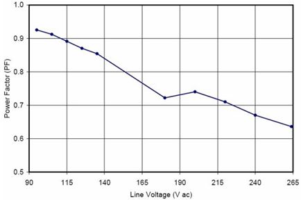 在針對商業(yè)照明的應(yīng)用中使用的是寬動態(tài)范圍的精確導(dǎo)通時間控制器方案NCL30000。設(shè)計中采用控制器(外置FET等旁路元件)方案的原因包括易于在能效和成本之間實現(xiàn)折衷、能以單顆控制器支持寬功率范圍(5到30 W)、及便于優(yōu)化散熱及靈活布線等?;贜CL30000構(gòu)建的90到305 Vac EFD25演示板(Vout = 12 LED, 37 Vdc)測試顯示,功率因數(shù)遠(yuǎn)高于0.9,部分輸入電壓條件下功率因數(shù)甚至高于0.95(見圖9),能效也極高。