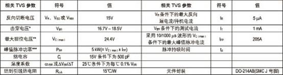 表1:熱插拔電路TVS元件的規(guī)格和細節(jié)(Littelfuse5.0SMDJ15A)