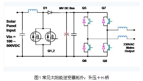升壓+H-橋拓?fù)涫翘柲苣孀兤鳂O為常用的拓?fù)渲?,是一種兩級非隔離拓?fù)洹F涞谝患壥巧龎杭?,用于把模塊的可變輸出電壓(例如100V – 500V)升高到更大的中間電壓,后者必須大于實(shí)際峰值主線電壓(如230V x sqrt(2),或>325V)。該升壓級還有一個重要作用,就是為了實(shí)現(xiàn)效率最大化,太陽能模塊必須運(yùn)作產(chǎn)生盡可能大的功率,而太陽能模塊的功率 曲線可通過輸出電流乘以輸出電壓數(shù)值獲得。功率特性中有一個最大點(diǎn),被稱為“最大功率點(diǎn)”或MPP,而這精確位置會隨著模塊的類型、溫度和日照陰影等因素而變化。