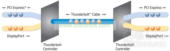 Thunderbolt接口由一顆Intel控制芯片驅(qū)動(dòng),通過(guò)PCI-E x4、DisplayPort總線與系統(tǒng)芯片組相連,也可以直接連接Intel處理器內(nèi)集成的圖形核心進(jìn)行DisplayPort輸出。
