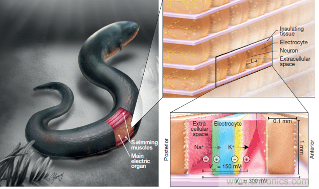 電鰻的所有放電體可以同時(shí)翻轉(zhuǎn),它們的微小電壓加起來(lái)就能產(chǎn)生強(qiáng)大的電能。
