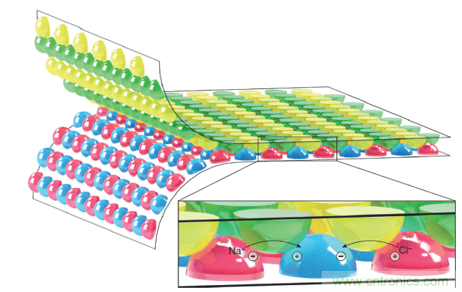 紅色凝膠含有鹽水,而藍(lán)色凝膠含有淡水。離子原本會(huì)從紅色凝膠流向藍(lán)色凝膠,但由于基板的間隔,無(wú)法出現(xiàn)這樣的流動(dòng)。與此同時(shí),與這塊基板對(duì)應(yīng)的另一塊基板上布置了綠色和黃色凝膠,當(dāng)它們橋接在藍(lán)色和紅色凝膠之間的空隙時(shí),就能為離子運(yùn)動(dòng)提供通道。
