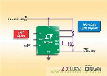 LTC7000是一款快速、高壓側(cè) N 溝道 MOSFET 柵極驅(qū)動器,主要接收一個參考于地的低電壓數(shù)字輸入信號,并以 35ns 的傳播延遲完全接通或關(guān)斷一個其漏極可高出地電位達 135V 的高壓側(cè) N 溝道 MOSFET。13ns的快速上升和下降時間 (當(dāng)驅(qū)動一個 1000pF 負(fù)載) 最大限度降低了