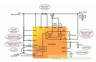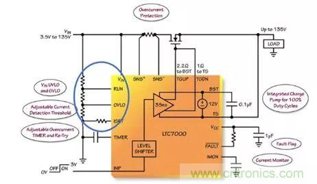 LTC7000 能夠避免負(fù)載遭受 VIN 引腳上的過壓和欠壓情況的損壞。“一個連接在 VIN 和地之間、且抽頭連接至 RUN 和 OVLO 引腳的簡單電阻分壓器將設(shè)定一個針對負(fù)載的有效操作窗口。當(dāng) VIN 位于由 RUN 和 OVLO 引腳所設(shè)定的操作窗口之外時,則關(guān)斷外部 MOSFET,并保護負(fù)載免遭潛在損壞或發(fā)生故障。” Mark Mullen這樣談到。