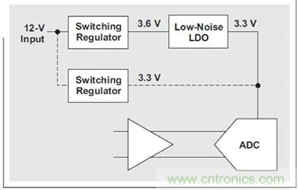 極大降低系統(tǒng)功耗的一種方法是對高速數(shù)據(jù)轉(zhuǎn)換器的電源進行優(yōu)化。數(shù)據(jù)轉(zhuǎn)換器 設(shè)計和工藝技術(shù)的一些最新進展,讓許多新型 ADC 可以直接由開關(guān)電源來驅(qū) 動,從而達到最大化功效的目的。 系統(tǒng)設(shè)計人員們習慣在開關(guān)穩(wěn)壓器和 ADC 之間使用一些低噪、低壓降穩(wěn)壓器 (LDO),以清除輸出噪聲和開關(guān)頻率諧波(請參見圖 1)。但是,這種干凈的電 源設(shè)計的代價是高功耗,因為 LDO 要求壓降余量來維持正常的運行。最低壓降 一般為 200 到 500mV,但在一些系統(tǒng)中其可以高達 1 到 2V(例如,ADC 的3.3-V 電壓軌產(chǎn)生自一個使用 LDO 的 5V 開關(guān)電源時)。