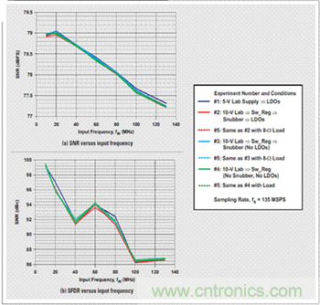 5 次實驗的結(jié)構(gòu)變化配置如下: 實驗 1—一個 5-V 實驗室電源直接連接到 5-V 模擬輸入,同時繞過開關(guān)穩(wěn)壓器(TPS5420) 和低噪聲 LDO (TPS79501)。使用一個板上 LDO(TI 的 TPS79633)生成 ADS5483 低敏感度 3.3-V 模擬及數(shù)字電源的 3.3-V 電壓軌。