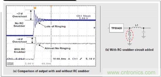 RC 緩沖器 降壓穩(wěn)壓器輸出能夠以相當高的開關(guān)速度對非常大的電壓實施開關(guān)操作。本文 中,將 TPS5420 的輸入電壓軌設(shè)定為 10V,我們可以在輸出端觀測到許多過沖 和振鈴,如圖 7a 所示。為了吸收一些電源電路電抗能量,我們將 RC 緩沖電 路添加到了 TPS5420 的輸出(請參見圖 7b)。