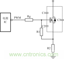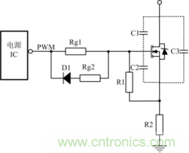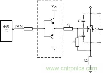開關管開通瞬時,驅(qū)動電路應能提供足夠大的充電電流使MOSFET柵源極間電壓迅速上升到所需值,保證開關管能快速開通且不存在上升沿的高頻振蕩。