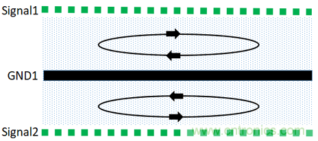 根據(jù)麥克斯韋方程,分立的帶電體或電流,它們之間的一切電的及磁的作用都是通過它們之間的中間區(qū)域傳遞的,不論中間區(qū)域是真空還是實(shí)體物質(zhì)。在PCB中磁通總是在傳輸線中傳播的,如果射頻回流路徑平行靠近其相應(yīng)的信號(hào)路徑,則回流路徑上的磁通與信號(hào)路徑上的磁通是方向相反的,這時(shí)它們相互疊加,則得到了通量對(duì)消的效果。