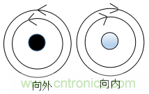 (2)當(dāng)有兩條彼此靠近且平行的導(dǎo)線,如下圖所示,其中一個(gè)導(dǎo)體的電流向外流出,另一個(gè)導(dǎo)體的電流向內(nèi)流入,如果流過這兩根導(dǎo)線的電流分別是信號(hào)電流和它的回流電流,那么這兩個(gè)電流是大小相等方向相反的,所以它們的磁場(chǎng)也是大小相等,而方向是相反的,因此能相互抵消。