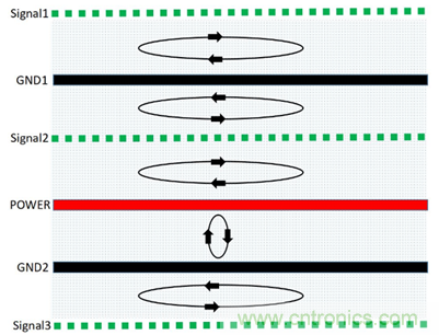 (1)由于信號(hào)層與回流參考平面相鄰,S1、S2、S3相鄰地平面,有最佳的磁通抵消效果,優(yōu)選布線層S2,其次S3、S1。