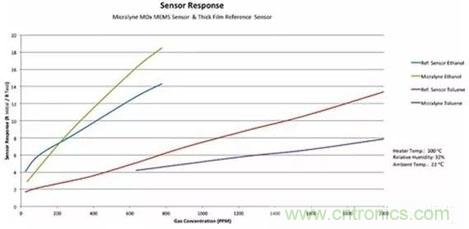 Micralyne對其MEMS MOS氣體傳感器的傳感響應(yīng),與傳統(tǒng)厚膜傳感器做了對比。在相對濕度32%,空氣中乙醇含量800ppm時,其MEMS MOS氣體傳感器達(dá)到和更大尺寸的厚膜傳感器(初始電阻和測試電阻比18:1)相近的靈敏度。對于所有的MOS傳感器,都必須考慮相對濕度,因?yàn)樵搮?shù)也會影響傳感器的電阻變化。Micralyne的MEMS MOS氣體傳感器還可以探測600~2000 ppm的甲苯,初始電阻和測試電阻比高至8:1。其MEMS傳感器的響應(yīng)時間小于1秒。并且,在氣流中移除被分析氣體后,電阻恢復(fù)速度要比傳統(tǒng)厚膜氣體傳感器快2倍。