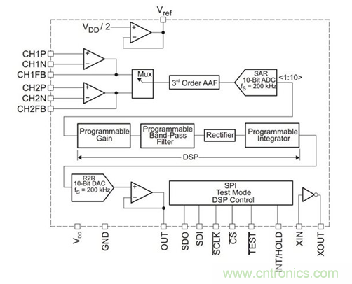 表 2 顯示了各種頻率輸入信號(hào)的輸出信號(hào)振幅的測(cè)試數(shù)據(jù)。  已對(duì)每個(gè)器件的帶通濾波器進(jìn)行編程,使其具有 6.94kHz 的中心頻率,因此應(yīng)抑制遠(yuǎn)離該中心頻率的輸入信號(hào)。