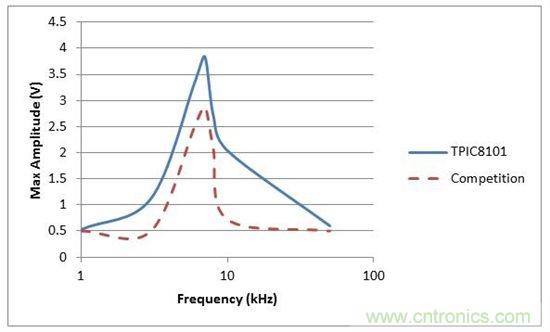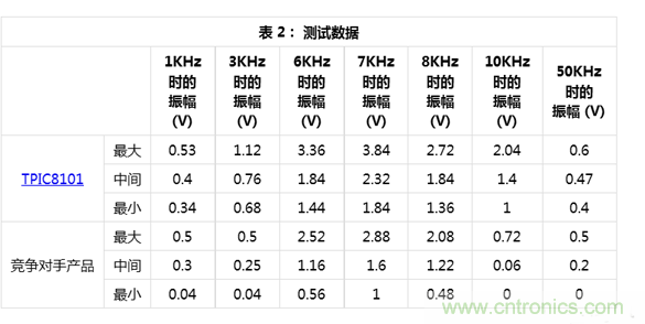 圖 2 顯示了表 1 中的結(jié)果。  噪聲等級(jí) () 在兩個(gè)器件之間大概是相同的,因?yàn)檫h(yuǎn)離中心頻率的振幅基本相同。  在中心頻率,TPIC8101 具有更高的振幅,這意味著其 SNR 要優(yōu)于競(jìng)爭(zhēng)產(chǎn)品。