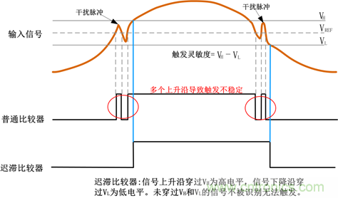 觸發(fā)電平只是一根參考電壓,而實(shí)際的波形在邊沿處是存在抖動的,如圖8所示,圖中波形的干擾非常小,但是上升沿還是存在鋸齒狀,當(dāng)噪聲很大時抖動會更劇烈。如果想穩(wěn)定觸發(fā)波形的上升沿,則需要在觸發(fā)電平的上下范圍內(nèi)使用遲滯比較,以過濾觸發(fā)電平附近的波形抖動和毛刺。這個遲滯范圍就是觸發(fā)靈敏度。