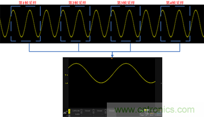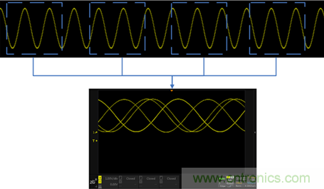 示波器的觸發(fā)條件的一個很關(guān)鍵的因素是觸發(fā)電平,觸發(fā)電平大多數(shù)情況下是用一根直流電平作為基準(zhǔn),當(dāng)信號的電壓超過該直流電平的時刻作為采樣波形的起始點(diǎn)。由于起始采樣的位置是有規(guī)律的,因此多次采樣的波形進(jìn)行疊加后看上去還是一個穩(wěn)定的波形。如圖3所示:
