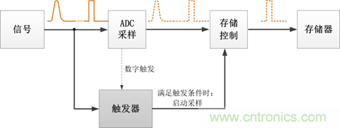 這就要靠觸發(fā)系統(tǒng)來實(shí)現(xiàn)。觸發(fā)的原理是一直監(jiān)控信號流,若發(fā)現(xiàn)信號滿足設(shè)定的觸發(fā)條件,觸發(fā)器記錄滿足條件的信號,啟動采樣;待數(shù)據(jù)采集完畢后,由控制器對信號進(jìn)行處理和顯示。具體如圖2所示。