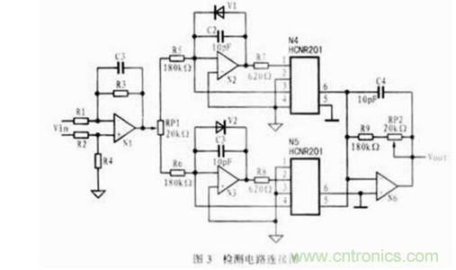 在實際檢測電路的某一采集信道中,如需對一組差動輸入信號進行檢測,可將電路接成如圖3所示的連接方式。圖中,通過放大器N1可將輸入的差動信號變?yōu)閱芜呅盘柡筝敵?。由于二極管V1和V2的作用,當輸入信號為正時,V2導(dǎo)通,V1截止,放大器N2呈開環(huán)狀態(tài),光耦N5工作,N4關(guān)斷;而當輸入信號為負時,則正好相反。當HCNR201的第3、4端的光敏二極管受光后,其輸出信號將反饋到放大器的輸入端,以提高光耦的線性并減少溫漂。第5、6端輸出的信號經(jīng)運放放大后輸出。電位器RP1的作用是調(diào)節(jié)運放輸入偏置電流的大小。電容C2、C3為反饋電容,可用于提高電路的穩(wěn)定性,消除自激振蕩,濾除電路中的毛刺信號,降低電路的輸出噪聲,其容值可根據(jù)電路的頻率特性來選取。放大器N6的作用是把光耦輸出的電流信號轉(zhuǎn)變?yōu)殡妷盒盘栆怨┖蠹夒娐肥褂?,并增強負載驅(qū)動能力,降低輸出阻抗。調(diào)整電阻RP2的值可以調(diào)整信道的增益。