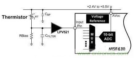 從技術(shù)上講,熱敏電阻是一種電阻器,它的電阻值隨溫度的變化而變化。如圖1中所示,需要一個偏置電路和少數(shù)幾個外部組件,在這里,偏置電阻器和熱敏電阻組成了一個分壓器,并且被接到一個可選運(yùn)算放大器上,這個運(yùn)算放大器與微控制器 (MCU) 的模數(shù)轉(zhuǎn)換器 (ADC) 相連,從而將熱敏電阻的電阻值轉(zhuǎn)換為一個溫度值。