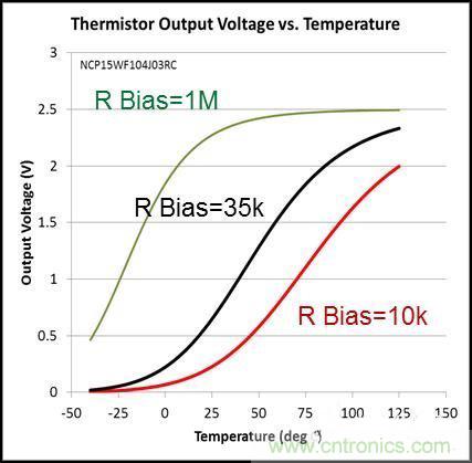 熱敏電阻的缺點(diǎn)是,只有在很窄的溫度范圍內(nèi),它的輸出才是線性和準(zhǔn)確的,而在這個范圍之外會變得非線性。圖2繪制了三條熱敏電阻的輸出曲線,偏置電阻分別為1MΩ、35kΩ和10kΩ。在窄溫度范圍內(nèi),每條曲線都是線性的,不過在偏置電阻分別為1MΩ、35kΩ和10kΩ,而溫度分別為10ºC、75ºC和50ºC以下時,這三條曲線為非線性。雖然針對特定溫度,可以使用專門校準(zhǔn)的熱敏電阻來實現(xiàn)目標(biāo)精度,但是這種熱敏電阻成本較高,并且這三款不同的器件也使得庫存管理變得過于復(fù)雜。其它缺點(diǎn)還包括無法預(yù)計的故障、抗擾度低和功耗較高。