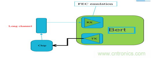 客戶的芯片的接收端可以支持FEC的糾錯功能,但要測試在不同的channel條件和不同的發(fā)送端均衡的設定下,芯片經(jīng)過FEC后的誤碼率能降低到多少,如果將信號直接環(huán)回到芯片的輸入端的話,需要不停的修改芯片的FEC的參數(shù)來進行測試,但由于其芯片每修改一次FEC的參數(shù)如FEC的symbol size, block size,content size等等都需要重新對芯片進行代碼編譯和下載,每次下載需要幾分鐘的時間,由于不同的條件都要測試,則組合數(shù)量很多,導致測試效率非常低。