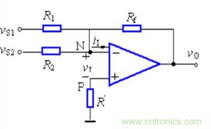 如下圖1-2,是運(yùn)放實(shí)現(xiàn)的加法器,用虛短和虛斷的方法來(lái)分析此電路。