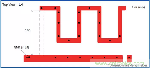 曲流型天線的長度比較難確定。長度一般比四分之一波長稍長,其長度由其幾何拓撲空間及敷地區(qū)決定。曲流型天線一般是PCB封裝,即板載天線。和倒F型一樣,天線一般放置在PCB頂層,鋪地一般放在頂層并位于天線附近,但天線周圍務必不能放置地,周圍應是凈空區(qū)。如圖2,圖3: