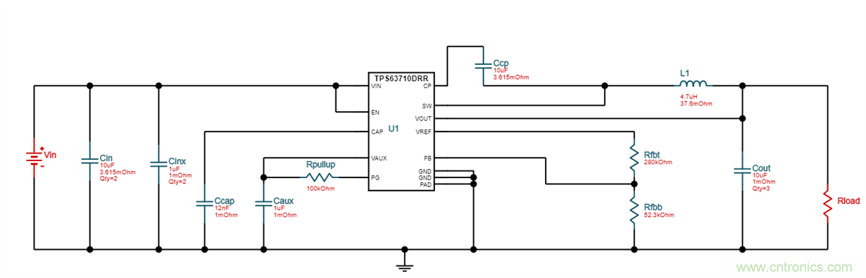 下圖是使用WEBENCH線上仿真工具生成的TPS63710參考電路,VIN=12V, VOUT=-5V, IOUT=1A: