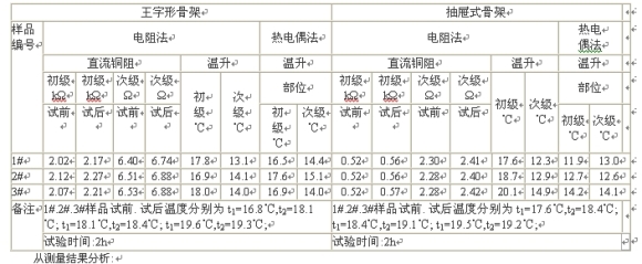 對于上述第二.三種情況,用電阻法測出的變壓器線包溫升一般要略高于用熱點偶法測出的溫升值。這說明用電阻法測出的變壓器線包溫升值更接近于變壓器實際溫升。至于用兩種方法測出的變壓器溫升值的差異程度,則和變壓器所采用的材料.變壓器的結(jié)構(gòu)以及我們在測量溫升時的布點位置(用熱電偶法)和測量速度有關(guān)。
