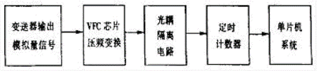 另一種模擬量傳輸?shù)慕鉀Q方法,就是采用VFC(電壓頻率轉(zhuǎn)換)方式,如圖3所示。現(xiàn)場變送器輸出模擬量信號(假設(shè)電壓信號),電壓頻率轉(zhuǎn)換器將變送器送來的電壓信號轉(zhuǎn)換成脈沖序列,通過光耦隔離后送出。在主機側(cè),通過一個頻率電壓轉(zhuǎn)換電路將脈沖序列還原成模擬信號。此時,相當(dāng)于光耦隔離的是數(shù)字量,可以消除光耦非線性的影響。這是一種有效、簡單易行的模擬量傳輸方式。