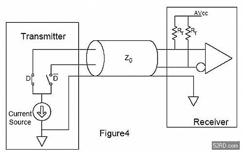 許多設計人員都很熟悉電壓驅動應用,并因此很自然地設想導通阻抗是開關選擇中最重要的規(guī)格。這種設想出于在電壓源應用中,導通阻抗往往會引起插損和信號衰減。但幸運地,HDMI 和 DVI信號并沒有這個問題,因為它們使用具有終端電阻的電流源來建立信號電平。圖4所示為如何建立TMDS信號的基本原理圖。