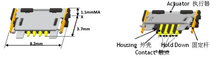 該連接器為0.2毫米(錯(cuò)位排列)連接間距,帶有0.4毫米導(dǎo)向位。目前可提供11針和29針,計(jì)劃最多達(dá)81針。連接器高度為0.9+/-毫米。其外殼材料為熱塑塑料(UL 94V-0), 固定調(diào)整片和連接器的銅合金無鹵素。作為底部接觸型產(chǎn)品,因此可最為廣泛地適用于掀蓋式執(zhí)行器,很方便進(jìn)行關(guān)門操作。就連接器規(guī)格而言,連接器可通過帶有外殼開槽結(jié)構(gòu)的耳式電纜分割結(jié)構(gòu)提供電纜預(yù)持功能。要求的電纜厚度是:0.2毫米+/-0.03
