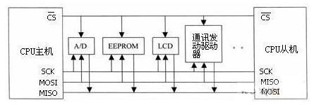 SPI(serial peripheral interface,串行外圍設(shè)備接口)總線技術(shù)是Motorola公司推出的一種同步串行接口。它用于CPU與各種外圍器件進行全雙工、同步串行通訊。它只需四條線就可以完成MCU與各種外圍器件的通訊,這四條線是:串行時鐘線(CSK)、主機輸入/從機輸出數(shù)據(jù)線(MISO)、主機輸出/從機輸入數(shù)據(jù)線(MOSI)、低電平有效從機選擇線CS。當SPI工作時,在移位寄存器中的數(shù)據(jù)逐位從輸出引腳(MOSI)輸出(高位在前),同時從輸入引腳(MISO)接收的數(shù)據(jù)逐位移到移位寄存器(高位在前)。發(fā)送一個字節(jié)后,從另一個外圍器件接收的字節(jié)數(shù)據(jù)進入移位寄存器中。即完成一個字節(jié)數(shù)據(jù)傳輸?shù)膶嵸|(zhì)是兩個器件寄存器內(nèi)容的交換。主SPI的時鐘信號(SCK)使傳輸同步。其典型系統(tǒng)框圖如下圖所示。
