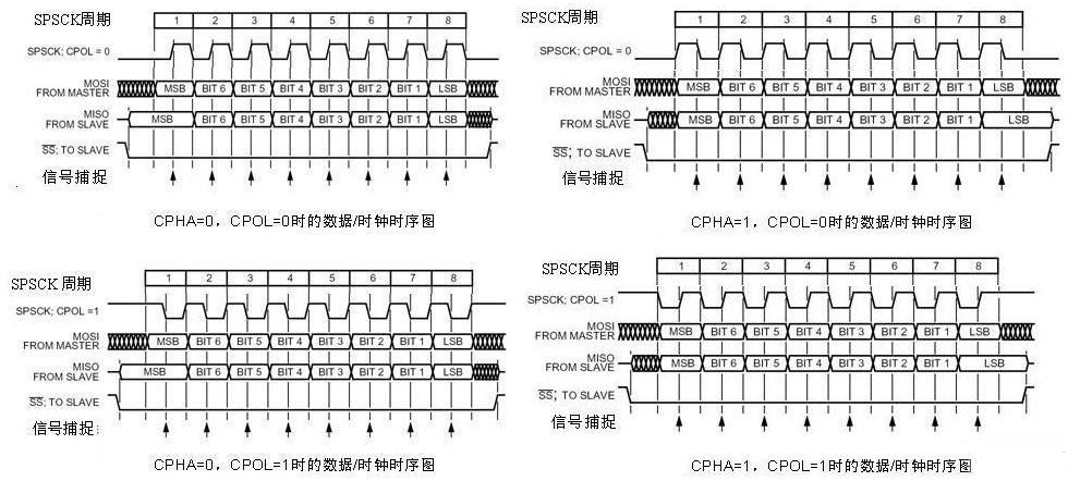 當CPHA=1、CPOL=0時SPI總線工作在方式3。MISO引腳和MOSI引腳上的數(shù)據(jù)的MSB位必須與SPSCK的第一個邊沿同步,在SPI傳輸過程中,在同步時鐘信號周期開始時(上升沿)數(shù)據(jù)上線,然后在同步時鐘信號的下降沿時,SPI的接收方捕捉位信號,在時鐘信號的一個周期結(jié)束時(上升沿),下一位數(shù)據(jù)信號上線,再重復(fù)上述過程,直到一個字節(jié)的8位信號傳輸結(jié)束。
