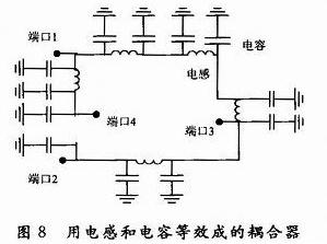 由于第二部分設(shè)計(jì)的天線傳輸線阻抗是50 Ω,所以1/4傳輸線的阻抗是70.7 Ω,將710 MHz代入,則可以求得L=15.8 nH,C=3.17 pF。這樣,就可以設(shè)計(jì)出180°的混合耦合器如圖8所示。將耦合器的3,4端口通過通孔連接天線,1,2端口接饋電網(wǎng)絡(luò),就可構(gòu)成一個(gè)雙天線的去耦合系統(tǒng)。