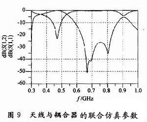 本文從s參數(shù)的角度分析了一個(gè)雙天線系統(tǒng)的去耦合方法,并通過一個(gè)天線設(shè)計(jì)實(shí)例,使用HFSS和ADS進(jìn)行去耦合前和去耦合后的仿真。結(jié)果顯示加入去耦合網(wǎng)絡(luò)和匹配網(wǎng)絡(luò)后兩個(gè)天線間的耦合可以降低至-35 dB以下,反射系數(shù)也可達(dá)到-15 dB以下,這滿足了工作于710 MHz的移動(dòng)設(shè)備的要求。