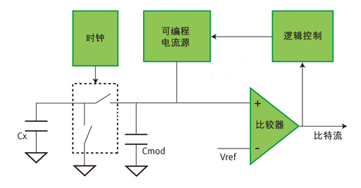 時鐘:本文提到的電容式感應系統(tǒng)是基于開關電容原理的。相反,物理上的傳感器電容通過在連續(xù)周期內(nèi)給傳感器電容充放電模擬成了電阻。模擬電阻和傳感器電容值成正比,可以用電流源和一個數(shù)模轉(zhuǎn)換器來計算傳感器電容實際值。