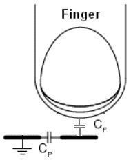 要感應到手指的存在,電容式感應系統(tǒng)首先要知道沒有手指時的傳感器電容(見圖2a),也稱為寄生電容(Cp)。當手指接近或接觸傳感器時(見圖2b),傳感器電容值將會變化,這就產(chǎn)生了和Cp并聯(lián)的另一個電容,稱為手指電容(Cf)。有手指存在時,總傳感器電容(Cx)如方程1所示: