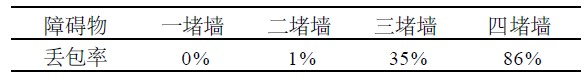 ②數(shù)據(jù)傳輸距離為30 m時(shí),隨著障礙物增加而產(chǎn)生的丟包率;實(shí)驗(yàn)數(shù)據(jù)分別如表1、表2所示。
