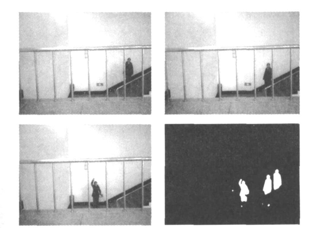 本系統(tǒng)采用運(yùn)動(dòng)目標(biāo)檢測算法,實(shí)現(xiàn)對(duì)監(jiān)視對(duì)象的圖像處理與異常判斷,占背景面積8‰的小目標(biāo)都能被系統(tǒng)識(shí)別。系統(tǒng)有效消除了因環(huán)境光線變化、背景微變、小目標(biāo)漸進(jìn)運(yùn)動(dòng)等因素引起的系統(tǒng)誤判。采用本系統(tǒng)軟、硬件進(jìn)行入侵事件檢測,其實(shí)驗(yàn)圖片及檢測效果如圖5所示。