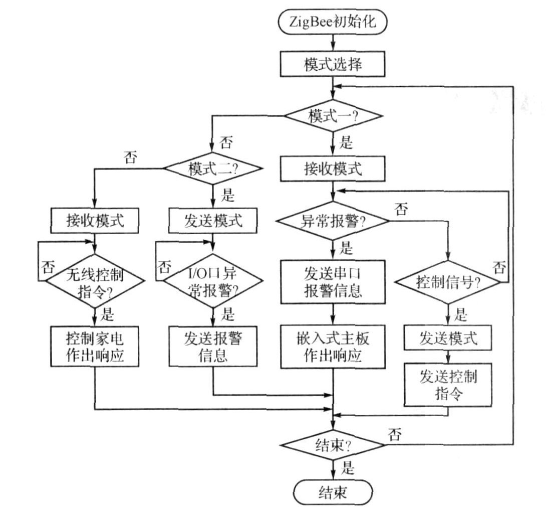 模式1.與系統(tǒng)主板相連。用來接收其他ZigBee模塊發(fā)送的報(bào)警信息和將主板給出的控制信息發(fā)送給其他ZigBee模塊,是主板與外部設(shè)備進(jìn)行無線通信的核心樞紐。