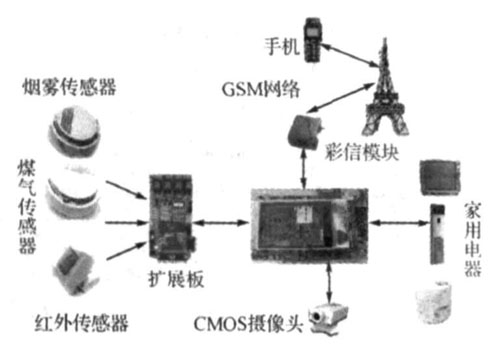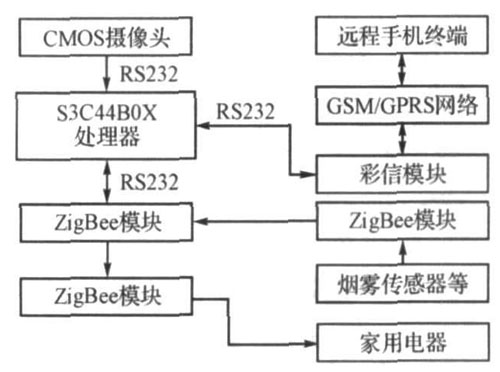 本系統(tǒng)采用模塊化設(shè)計(jì)方案。以嵌入式系統(tǒng)主板為核心,通過CMOS攝像頭對(duì)關(guān)鍵部位進(jìn)行安全監(jiān)測,通過手機(jī)傳遞安全信息和圖像彩信,并對(duì)家用電器進(jìn)行遠(yuǎn)程控制,利用ZigBee模塊實(shí)現(xiàn)家用電器、系統(tǒng)主板和煙霧、溫度、煤氣等傳感器的無線聯(lián)網(wǎng)。