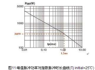 我們要解決的問題是根據(jù)所要消除的電涌來確定保護(hù)元器件的參數(shù)。以圖8中的ISO7637-2 脈沖2為例,不難看出,抑制器上的鉗制電壓大約是30V,峰值脈沖電流 (Ip)大約是12A,在Ip/2點(diǎn)測得電流脈沖時(shí)長(tp)是4μs。因此,可判定TVS必須消耗360W的最大脈沖功率(Pp) 。所有這些Pp、Ip和tp值是有用的,因?yàn)樗鼈兛梢詭椭容^TVS數(shù)據(jù)表中的峰值脈沖功率對指數(shù)脈沖時(shí)長的曲線,以確保TVS在應(yīng)用的限制范圍內(nèi)。