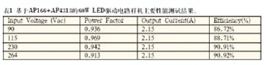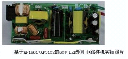 AP1661是一款工作于臨界導(dǎo)通模式下的有源功率因數(shù)校正控制芯片,可廣泛應(yīng)用于開關(guān)電源、LED驅(qū)動和電子鎮(zhèn)流器的預(yù)調(diào)整變換器控制。該芯 片內(nèi)部包括1個啟動定時器可滿足待機應(yīng)用要求,1個能實現(xiàn)接近于1的功率因數(shù)的單象限乘法器和1個零電流檢測模塊確保臨界斷續(xù)方式工作。AP1661的圖 騰柱驅(qū)動輸出能夠為外部MOSFET或IGBT提供最大600mA驅(qū)動電流和800mA關(guān)斷電流能力。采用了先進的雙極型互補金屬氧化物半導(dǎo)體設(shè)計和制造 工藝,具有低啟動電流,低工作電流和低功耗的特點。AP1661同時具有完善的保護功能,包括過壓保護、帶有滯后的輸入欠壓鎖定和乘法器輸出嵌位以限制開 關(guān)最大峰值電流。圖7為該方案60W應(yīng)用電路樣機實物照片。圖8為應(yīng)用該方案LED直管燈實物照片。