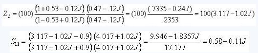 舉個例子,用100歐姆阻抗表征的復合回波損耗S11=0.53-0.12J轉換到90歐姆的如下: