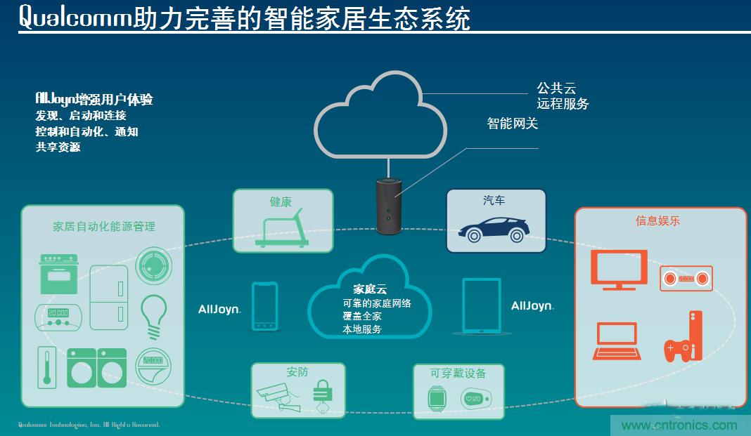 Qualcomm創(chuàng)銳訊物聯(lián)網(wǎng)市場經(jīng)理貝曉珊女士在 “IoE互聯(lián)家庭解決方案概述”主題演講中談到,盡管不同的分析機構(gòu)給出了不同的數(shù)據(jù),但結(jié)論是統(tǒng)一的,即物聯(lián)網(wǎng)市場規(guī)模的巨大化。而高通創(chuàng)銳訊將致力于端到端的IOE解決方案,助力完善智能家居生態(tài)系統(tǒng)。會議上貝曉珊詳細介紹了兩款WIFI芯片產(chǎn)品QCA4004和QCA4531以及AllJoyn SDK軟件平臺。