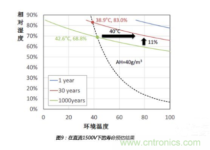 從上圖可以看出,相對(duì)濕度增加11%或者溫度增加40℃,都會(huì)造成壽命從1000年減為30年,所以,相對(duì)來(lái)說(shuō),相對(duì)濕度的影響比溫度影響更大。一般來(lái)說(shuō),當(dāng)變流器內(nèi)部升溫時(shí),絕對(duì)濕度會(huì)保持不變。如果環(huán)境條件從溫度38.9℃、相對(duì)濕度83.0%變?yōu)闇囟?2.6℃、相對(duì)濕度68.8%,但是絕對(duì)濕度值保持40g/m3,壽命會(huì)從30年增加到1000年。所以,預(yù)加熱是一種非常有效的抑制濕度失效的方法。